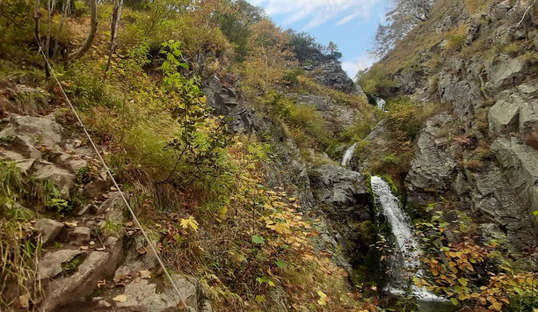 Водопад представляет серию из трёх последовательных каскадов. Спуск к водопаду по тропинке, вдоль натянута верёвка. Возвращение по пути подхода.